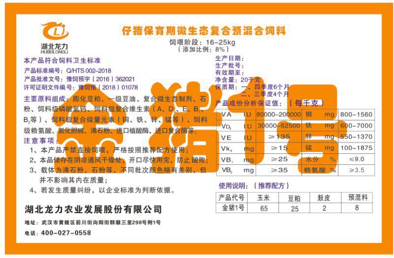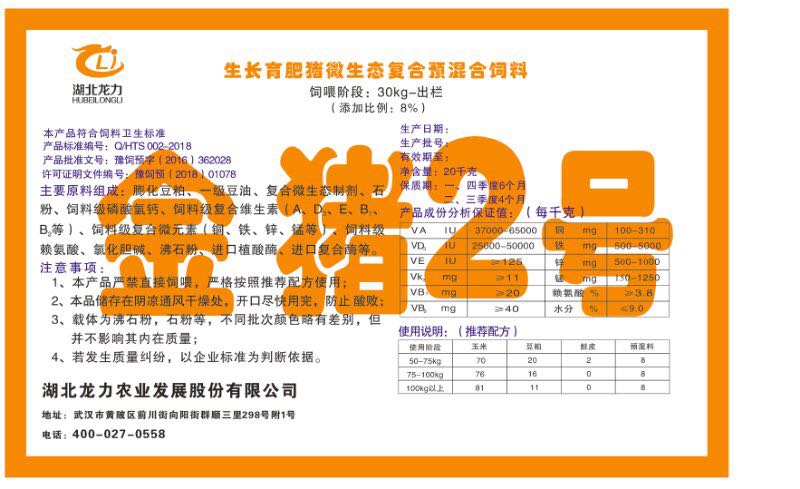 湖北龍力農業發展股份有限公司坐落于武漢市黃陂區前川街向陽街群順三里298號附1號。公司成立于2014年6月,公司自成立以來把“創全球最大養豬綜合服務”為企業愿景。致力于打造教保料品牌”作為公司發展的明確目標。公司一直致力于豬營養的研究和開發,積極與國內外高校和科研機構合作,推廣養豬技術、動物營養新概念,向世界農牧企業學習與合作。公司采用國內先進的生產工藝,選擇高精度電子配料秤,高均勻度、無殘留混合機等先進設備....